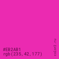 Цвет #EB2AB1 в цветовой модели RGB обозначается тремя октетами (235, 42, 177) в десятичном формате и #EB2AB1 в шестнадцатиричном (hex) формате, которые являются интенсивностью красного 235 (hex EB), интенсивность зелёного 42 (hex 2A) и интенсивность синего 177 (hex B1).