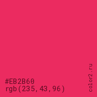 Цвет #EB2B60 в цветовой модели RGB обозначается тремя октетами (235, 43, 96) в десятичном формате и #EB2B60 в шестнадцатиричном (hex) формате, которые являются интенсивностью красного 235 (hex EB), интенсивность зелёного 43 (hex 2B) и интенсивность синего 96 (hex 60).
