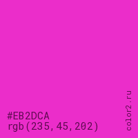 Цвет #EB2DCA в цветовой модели RGB обозначается тремя октетами (235, 45, 202) в десятичном формате и #EB2DCA в шестнадцатиричном (hex) формате, которые являются интенсивностью красного 235 (hex EB), интенсивность зелёного 45 (hex 2D) и интенсивность синего 202 (hex CA).