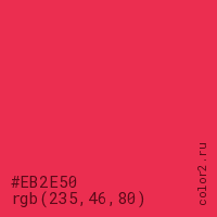 Цвет #EB2E50 в цветовой модели RGB обозначается тремя октетами (235, 46, 80) в десятичном формате и #EB2E50 в шестнадцатиричном (hex) формате, которые являются интенсивностью красного 235 (hex EB), интенсивность зелёного 46 (hex 2E) и интенсивность синего 80 (hex 50).