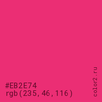Цвет #EB2E74 в цветовой модели RGB обозначается тремя октетами (235, 46, 116) в десятичном формате и #EB2E74 в шестнадцатиричном (hex) формате, которые являются интенсивностью красного 235 (hex EB), интенсивность зелёного 46 (hex 2E) и интенсивность синего 116 (hex 74).