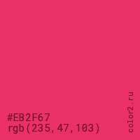 Цвет #EB2F67 в цветовой модели RGB обозначается тремя октетами (235, 47, 103) в десятичном формате и #EB2F67 в шестнадцатиричном (hex) формате, которые являются интенсивностью красного 235 (hex EB), интенсивность зелёного 47 (hex 2F) и интенсивность синего 103 (hex 67).