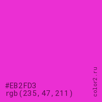 Цвет #EB2FD3 в цветовой модели RGB обозначается тремя октетами (235, 47, 211) в десятичном формате и #EB2FD3 в шестнадцатиричном (hex) формате, которые являются интенсивностью красного 235 (hex EB), интенсивность зелёного 47 (hex 2F) и интенсивность синего 211 (hex D3).