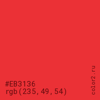 Цвет #EB3136 в цветовой модели RGB обозначается тремя октетами (235, 49, 54) в десятичном формате и #EB3136 в шестнадцатиричном (hex) формате, которые являются интенсивностью красного 235 (hex EB), интенсивность зелёного 49 (hex 31) и интенсивность синего 54 (hex 36).
