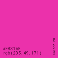 Цвет #EB31AB в цветовой модели RGB обозначается тремя октетами (235, 49, 171) в десятичном формате и #EB31AB в шестнадцатиричном (hex) формате, которые являются интенсивностью красного 235 (hex EB), интенсивность зелёного 49 (hex 31) и интенсивность синего 171 (hex AB).