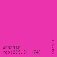 Цвет #EB33AE в цветовой модели RGB обозначается тремя октетами (235, 51, 174) в десятичном формате и #EB33AE в шестнадцатиричном (hex) формате, которые являются интенсивностью красного 235 (hex EB), интенсивность зелёного 51 (hex 33) и интенсивность синего 174 (hex AE).