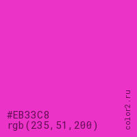 Цвет #EB33C8 в цветовой модели RGB обозначается тремя октетами (235, 51, 200) в десятичном формате и #EB33C8 в шестнадцатиричном (hex) формате, которые являются интенсивностью красного 235 (hex EB), интенсивность зелёного 51 (hex 33) и интенсивность синего 200 (hex C8).