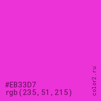 Цвет #EB33D7 в цветовой модели RGB обозначается тремя октетами (235, 51, 215) в десятичном формате и #EB33D7 в шестнадцатиричном (hex) формате, которые являются интенсивностью красного 235 (hex EB), интенсивность зелёного 51 (hex 33) и интенсивность синего 215 (hex D7).