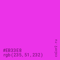 Цвет #EB33E8 в цветовой модели RGB обозначается тремя октетами (235, 51, 232) в десятичном формате и #EB33E8 в шестнадцатиричном (hex) формате, которые являются интенсивностью красного 235 (hex EB), интенсивность зелёного 51 (hex 33) и интенсивность синего 232 (hex E8).