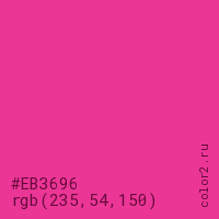 Цвет #EB3696 в цветовой модели RGB обозначается тремя октетами (235, 54, 150) в десятичном формате и #EB3696 в шестнадцатиричном (hex) формате, которые являются интенсивностью красного 235 (hex EB), интенсивность зелёного 54 (hex 36) и интенсивность синего 150 (hex 96).