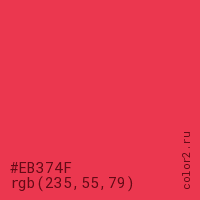 Цвет #EB374F в цветовой модели RGB обозначается тремя октетами (235, 55, 79) в десятичном формате и #EB374F в шестнадцатиричном (hex) формате, которые являются интенсивностью красного 235 (hex EB), интенсивность зелёного 55 (hex 37) и интенсивность синего 79 (hex 4F).