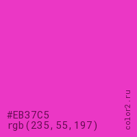 Цвет #EB37C5 в цветовой модели RGB обозначается тремя октетами (235, 55, 197) в десятичном формате и #EB37C5 в шестнадцатиричном (hex) формате, которые являются интенсивностью красного 235 (hex EB), интенсивность зелёного 55 (hex 37) и интенсивность синего 197 (hex C5).