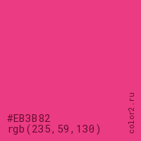 Цвет #EB3B82 в цветовой модели RGB обозначается тремя октетами (235, 59, 130) в десятичном формате и #EB3B82 в шестнадцатиричном (hex) формате, которые являются интенсивностью красного 235 (hex EB), интенсивность зелёного 59 (hex 3B) и интенсивность синего 130 (hex 82).
