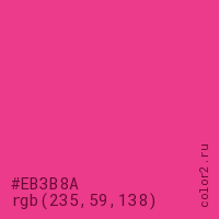 Цвет #EB3B8A в цветовой модели RGB обозначается тремя октетами (235, 59, 138) в десятичном формате и #EB3B8A в шестнадцатиричном (hex) формате, которые являются интенсивностью красного 235 (hex EB), интенсивность зелёного 59 (hex 3B) и интенсивность синего 138 (hex 8A).