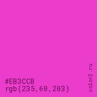 Цвет #EB3CCB в цветовой модели RGB обозначается тремя октетами (235, 60, 203) в десятичном формате и #EB3CCB в шестнадцатиричном (hex) формате, которые являются интенсивностью красного 235 (hex EB), интенсивность зелёного 60 (hex 3C) и интенсивность синего 203 (hex CB).