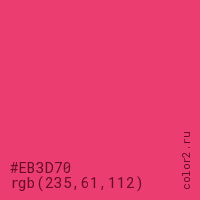 Цвет #EB3D70 в цветовой модели RGB обозначается тремя октетами (235, 61, 112) в десятичном формате и #EB3D70 в шестнадцатиричном (hex) формате, которые являются интенсивностью красного 235 (hex EB), интенсивность зелёного 61 (hex 3D) и интенсивность синего 112 (hex 70).