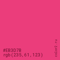 Цвет #EB3D7B в цветовой модели RGB обозначается тремя октетами (235, 61, 123) в десятичном формате и #EB3D7B в шестнадцатиричном (hex) формате, которые являются интенсивностью красного 235 (hex EB), интенсивность зелёного 61 (hex 3D) и интенсивность синего 123 (hex 7B).