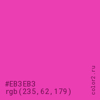 Цвет #EB3EB3 в цветовой модели RGB обозначается тремя октетами (235, 62, 179) в десятичном формате и #EB3EB3 в шестнадцатиричном (hex) формате, которые являются интенсивностью красного 235 (hex EB), интенсивность зелёного 62 (hex 3E) и интенсивность синего 179 (hex B3).