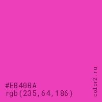 Цвет #EB40BA в цветовой модели RGB обозначается тремя октетами (235, 64, 186) в десятичном формате и #EB40BA в шестнадцатиричном (hex) формате, которые являются интенсивностью красного 235 (hex EB), интенсивность зелёного 64 (hex 40) и интенсивность синего 186 (hex BA).