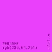 Цвет #EB40FB в цветовой модели RGB обозначается тремя октетами (235, 64, 251) в десятичном формате и #EB40FB в шестнадцатиричном (hex) формате, которые являются интенсивностью красного 235 (hex EB), интенсивность зелёного 64 (hex 40) и интенсивность синего 251 (hex FB).