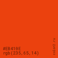 Цвет #EB410E в цветовой модели RGB обозначается тремя октетами (235, 65, 14) в десятичном формате и #EB410E в шестнадцатиричном (hex) формате, которые являются интенсивностью красного 235 (hex EB), интенсивность зелёного 65 (hex 41) и интенсивность синего 14 (hex 0E).