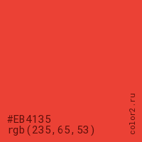 Цвет #EB4135 в цветовой модели RGB обозначается тремя октетами (235, 65, 53) в десятичном формате и #EB4135 в шестнадцатиричном (hex) формате, которые являются интенсивностью красного 235 (hex EB), интенсивность зелёного 65 (hex 41) и интенсивность синего 53 (hex 35).