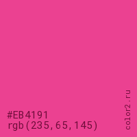 Цвет #EB4191 в цветовой модели RGB обозначается тремя октетами (235, 65, 145) в десятичном формате и #EB4191 в шестнадцатиричном (hex) формате, которые являются интенсивностью красного 235 (hex EB), интенсивность зелёного 65 (hex 41) и интенсивность синего 145 (hex 91).