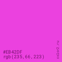 Цвет #EB42DF в цветовой модели RGB обозначается тремя октетами (235, 66, 223) в десятичном формате и #EB42DF в шестнадцатиричном (hex) формате, которые являются интенсивностью красного 235 (hex EB), интенсивность зелёного 66 (hex 42) и интенсивность синего 223 (hex DF).