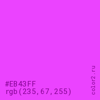 Цвет #EB43FF в цветовой модели RGB обозначается тремя октетами (235, 67, 255) в десятичном формате и #EB43FF в шестнадцатиричном (hex) формате, которые являются интенсивностью красного 235 (hex EB), интенсивность зелёного 67 (hex 43) и интенсивность синего 255 (hex FF).