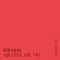 Цвет #EB444A в цветовой модели RGB обозначается тремя октетами (235, 68, 74) в десятичном формате и #EB444A в шестнадцатиричном (hex) формате, которые являются интенсивностью красного 235 (hex EB), интенсивность зелёного 68 (hex 44) и интенсивность синего 74 (hex 4A).