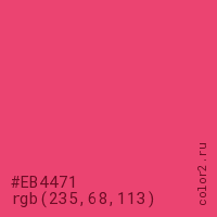 Цвет #EB4471 в цветовой модели RGB обозначается тремя октетами (235, 68, 113) в десятичном формате и #EB4471 в шестнадцатиричном (hex) формате, которые являются интенсивностью красного 235 (hex EB), интенсивность зелёного 68 (hex 44) и интенсивность синего 113 (hex 71).