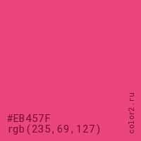 Цвет #EB457F в цветовой модели RGB обозначается тремя октетами (235, 69, 127) в десятичном формате и #EB457F в шестнадцатиричном (hex) формате, которые являются интенсивностью красного 235 (hex EB), интенсивность зелёного 69 (hex 45) и интенсивность синего 127 (hex 7F).