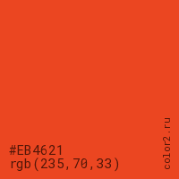 Цвет #EB4621 в цветовой модели RGB обозначается тремя октетами (235, 70, 33) в десятичном формате и #EB4621 в шестнадцатиричном (hex) формате, которые являются интенсивностью красного 235 (hex EB), интенсивность зелёного 70 (hex 46) и интенсивность синего 33 (hex 21).