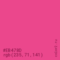 Цвет #EB478D в цветовой модели RGB обозначается тремя октетами (235, 71, 141) в десятичном формате и #EB478D в шестнадцатиричном (hex) формате, которые являются интенсивностью красного 235 (hex EB), интенсивность зелёного 71 (hex 47) и интенсивность синего 141 (hex 8D).