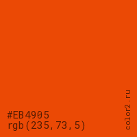 Цвет #EB4905 в цветовой модели RGB обозначается тремя октетами (235, 73, 5) в десятичном формате и #EB4905 в шестнадцатиричном (hex) формате, которые являются интенсивностью красного 235 (hex EB), интенсивность зелёного 73 (hex 49) и интенсивность синего 5 (hex 05).