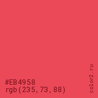 Цвет #EB4958 в цветовой модели RGB обозначается тремя октетами (235, 73, 88) в десятичном формате и #EB4958 в шестнадцатиричном (hex) формате, которые являются интенсивностью красного 235 (hex EB), интенсивность зелёного 73 (hex 49) и интенсивность синего 88 (hex 58).