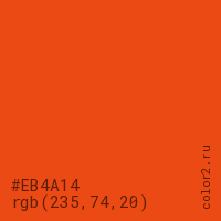 Цвет #EB4A14 в цветовой модели RGB обозначается тремя октетами (235, 74, 20) в десятичном формате и #EB4A14 в шестнадцатиричном (hex) формате, которые являются интенсивностью красного 235 (hex EB), интенсивность зелёного 74 (hex 4A) и интенсивность синего 20 (hex 14).