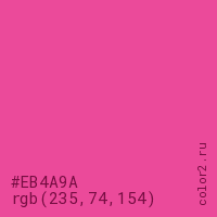 Цвет #EB4A9A в цветовой модели RGB обозначается тремя октетами (235, 74, 154) в десятичном формате и #EB4A9A в шестнадцатиричном (hex) формате, которые являются интенсивностью красного 235 (hex EB), интенсивность зелёного 74 (hex 4A) и интенсивность синего 154 (hex 9A).