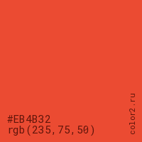 Цвет #EB4B32 в цветовой модели RGB обозначается тремя октетами (235, 75, 50) в десятичном формате и #EB4B32 в шестнадцатиричном (hex) формате, которые являются интенсивностью красного 235 (hex EB), интенсивность зелёного 75 (hex 4B) и интенсивность синего 50 (hex 32).