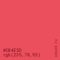 Цвет #EB4E5D в цветовой модели RGB обозначается тремя октетами (235, 78, 93) в десятичном формате и #EB4E5D в шестнадцатиричном (hex) формате, которые являются интенсивностью красного 235 (hex EB), интенсивность зелёного 78 (hex 4E) и интенсивность синего 93 (hex 5D).