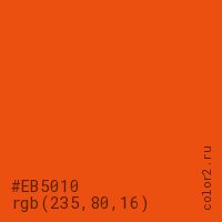 Цвет #EB5010 в цветовой модели RGB обозначается тремя октетами (235, 80, 16) в десятичном формате и #EB5010 в шестнадцатиричном (hex) формате, которые являются интенсивностью красного 235 (hex EB), интенсивность зелёного 80 (hex 50) и интенсивность синего 16 (hex 10).