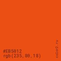 Цвет RGB(235, 80, 18) в процентом отношении количества цвета состоит из 92.2% красного (red), 31.4% зелёного (green) и 7.1% синего (blue).