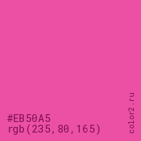 Цвет #EB50A5 в цветовой модели RGB обозначается тремя октетами (235, 80, 165) в десятичном формате и #EB50A5 в шестнадцатиричном (hex) формате, которые являются интенсивностью красного 235 (hex EB), интенсивность зелёного 80 (hex 50) и интенсивность синего 165 (hex A5).