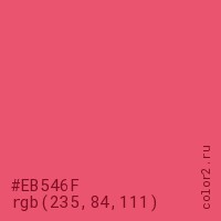 Цвет #EB546F в цветовой модели RGB обозначается тремя октетами (235, 84, 111) в десятичном формате и #EB546F в шестнадцатиричном (hex) формате, которые являются интенсивностью красного 235 (hex EB), интенсивность зелёного 84 (hex 54) и интенсивность синего 111 (hex 6F).