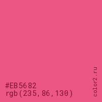 Цвет #EB5682 в цветовой модели RGB обозначается тремя октетами (235, 86, 130) в десятичном формате и #EB5682 в шестнадцатиричном (hex) формате, которые являются интенсивностью красного 235 (hex EB), интенсивность зелёного 86 (hex 56) и интенсивность синего 130 (hex 82).