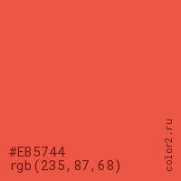 Цвет #EB5744 в цветовой модели RGB обозначается тремя октетами (235, 87, 68) в десятичном формате и #EB5744 в шестнадцатиричном (hex) формате, которые являются интенсивностью красного 235 (hex EB), интенсивность зелёного 87 (hex 57) и интенсивность синего 68 (hex 44).