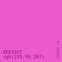 Цвет #EB5ACF в цветовой модели RGB обозначается тремя октетами (235, 90, 207) в десятичном формате и #EB5ACF в шестнадцатиричном (hex) формате, которые являются интенсивностью красного 235 (hex EB), интенсивность зелёного 90 (hex 5A) и интенсивность синего 207 (hex CF).