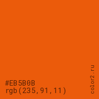 Цвет #EB5B0B в цветовой модели RGB обозначается тремя октетами (235, 91, 11) в десятичном формате и #EB5B0B в шестнадцатиричном (hex) формате, которые являются интенсивностью красного 235 (hex EB), интенсивность зелёного 91 (hex 5B) и интенсивность синего 11 (hex 0B).