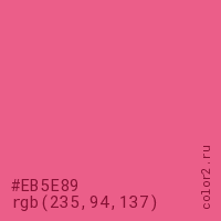 Цвет #EB5E89 в цветовой модели RGB обозначается тремя октетами (235, 94, 137) в десятичном формате и #EB5E89 в шестнадцатиричном (hex) формате, которые являются интенсивностью красного 235 (hex EB), интенсивность зелёного 94 (hex 5E) и интенсивность синего 137 (hex 89).