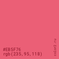 Цвет #EB5F76 в цветовой модели RGB обозначается тремя октетами (235, 95, 118) в десятичном формате и #EB5F76 в шестнадцатиричном (hex) формате, которые являются интенсивностью красного 235 (hex EB), интенсивность зелёного 95 (hex 5F) и интенсивность синего 118 (hex 76).